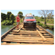 Die Piste bleibt schmal und abenteuerlich, doch wird etwas besser. Es verändert sich die Landschaft erneut, es wird flacher, die Hügel verschwinden allmählich und der Untergrund wird sandiger. Im Hintergrund sind noch Reste eines Waldes erkennbar. Zum ersten Mal seit Tagen können wir in den 4. Gang (!) schalten, wir kommen gut voran und so erreichen wir in Esama Fähre Nummer 6.