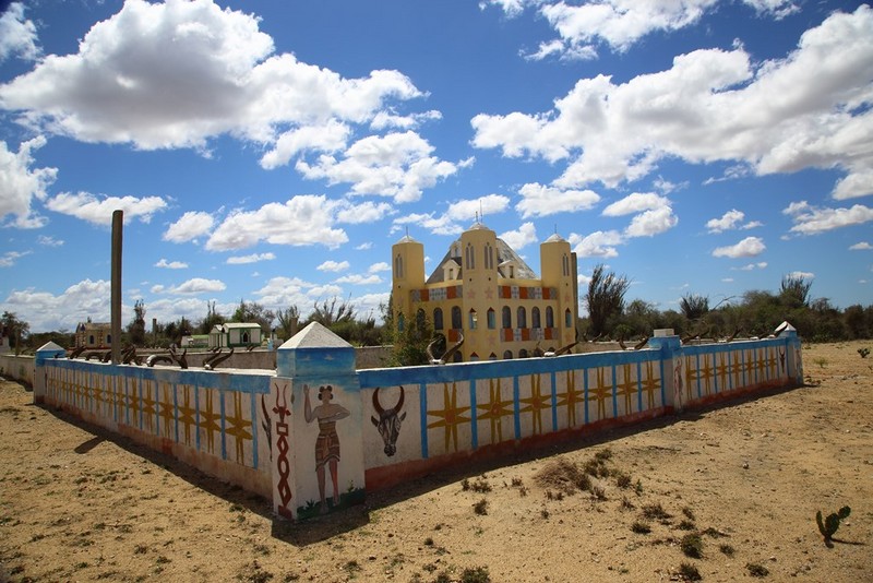 Und obwohl das Land so spärlich bewachsen ist, ist es Rinderland. Die Tiere werden von halbwüchsigen, jungen Männern gehütet, einige davon ausgestattet mit Speeren. Die Frauen tragen lange Zöpfe und bunte Kleider. Ein permanenter, ungemütlicher Wind pfeift über das flache Land. Zwischen den vielen Kakteen und Dornenbüschen werden immer wieder kleine Felder für den Eigenbedarf bestellt.