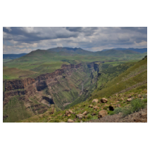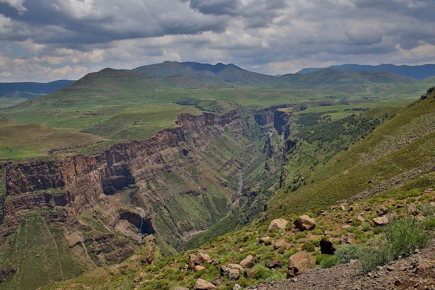 Die nagelneue, super ausgebaute Bergstraße, vom Feinsten, ermöglicht es uns, auch bei ins Landesinnere abzubiegen. Auf abenteuerlichen Steigungen, über Serpentinen und enge Kurven erklimmen wir das Hochland von 1.540m hinauf auf 2.755m und blicken in tiefe Flusstäler in Richtung Semonkong.