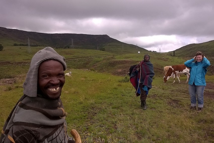Maseru ist keine Schönheit, daher durchqueren wir die Stadt in Richtung Süden und bleiben außerhalb irgendwo an einem Feld stehen für die Nacht. Zwei Jugendliche, die Kühe hüten, trauen sich zu uns und es beginnt ein interessantes Gespräch. Schüchtern aber durchaus selbstbewusst fragen sie nach woher wir kommen. Ja, Deutschland, das haben sie schon mal gehört. Thomas Müller ist ihnen ein Begriff. Beide gehen auf die High-School in einer naheliegenden Stadt. Der eine will Arzt werden, der andere Sozialarbeiter. Am Sonntag, so erzählen sie, helfen sie in der Familie, indem sie Kühe hüten. Während der Woche beschäftigt die Familie gegen Monatslohn einen Hirten. Sie haben ein bzw. zwei Geschwister, die Familien in Lesotho sind kleiner als im sonstigen Afrika, es gibt weniger Kinder. Beide klingen etwas verzagt, denn sie sehen wenige Jobmöglichkeiten in ihrem Land. Aus diesem Grund wollen sie ins Ausland, am liebsten nach Europa, und wenn das nicht geht, dann wenigstens nach Südafrika.